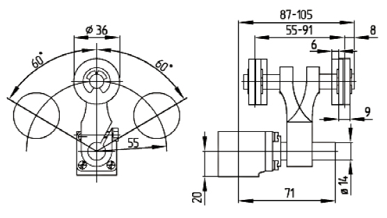 - ● :對(duì)耐溫型產(chǎn)品,滾輪可以安裝在軸兩個(gè)不同位置上